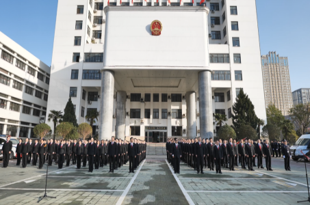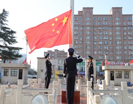 仪式开始,法警护旗队迈着铿锵有力、整齐划一的步伐,护卫五星红旗昂首走向升旗台。伴随着雄壮激昂的《义勇军进行曲》,鲜艳的五星红旗冉冉升起、迎风飘扬。全体干警肃立注目、齐唱国歌,目光坚定、神情庄重,向伟大祖国致以崇高敬意。