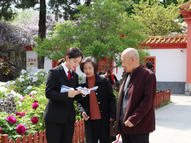 春日和煦,花开正好。南阳世界月季大观园中,游客穿梭其间拍照打卡、赏景休憩,尽享春日美好。宛城区法院刑事审判庭的干警们走进园区,将普法宣传融入如画美景之中。